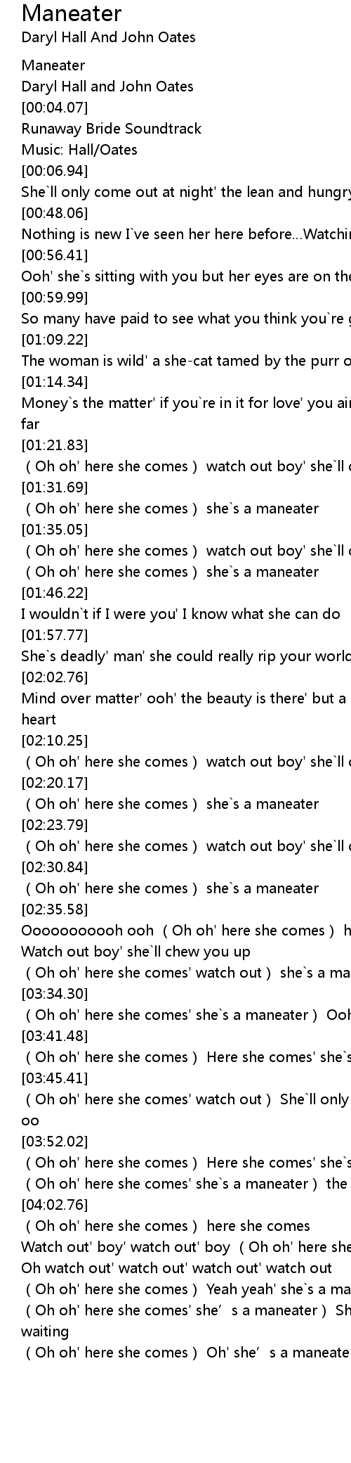 | [04:16.67] | (Oh oh' here she comes' she’s a maneater) She’s watching and waiting |