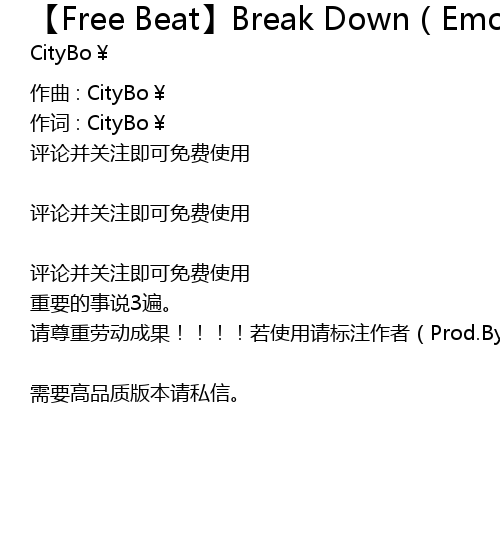 | 请尊重劳动成果!!!!若使用请标注作者(Prod.ByCityBo¥),但不得用于商业。侵权必究 | |