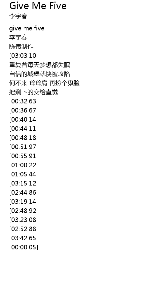 | [03:30.83][03:15.12][02:43.07][02:27.26][01:21.78][01:05.95] | give me five |