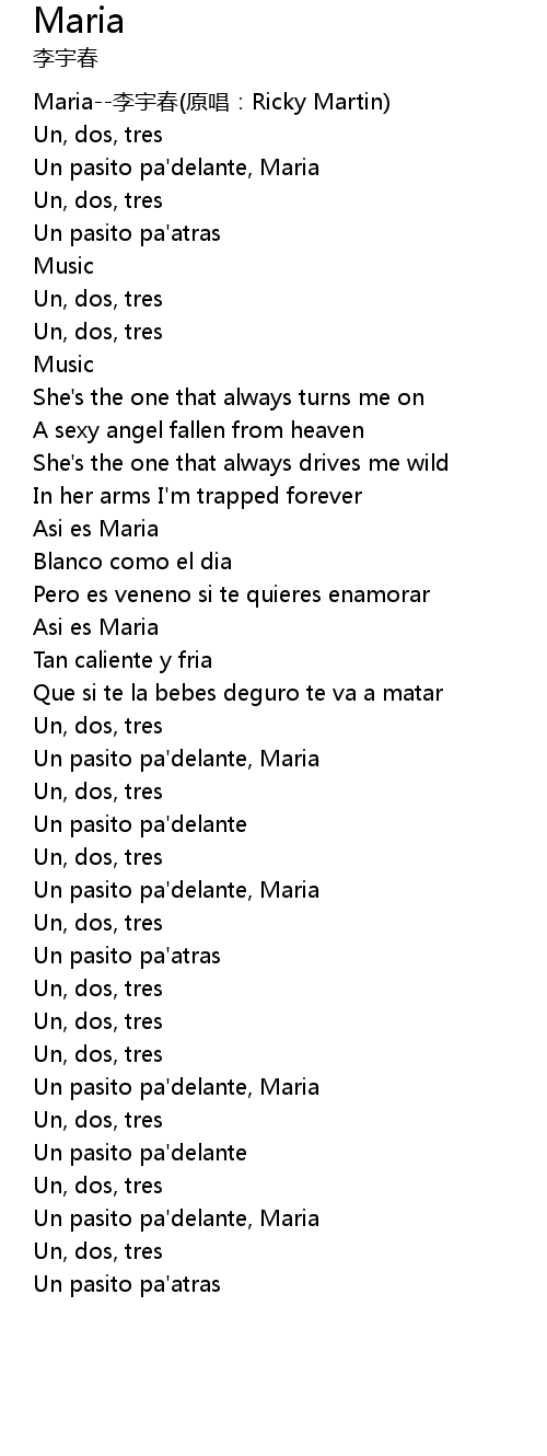 | [00:00.00] | Maria--李宇春(原唱:Ricky Martin) |