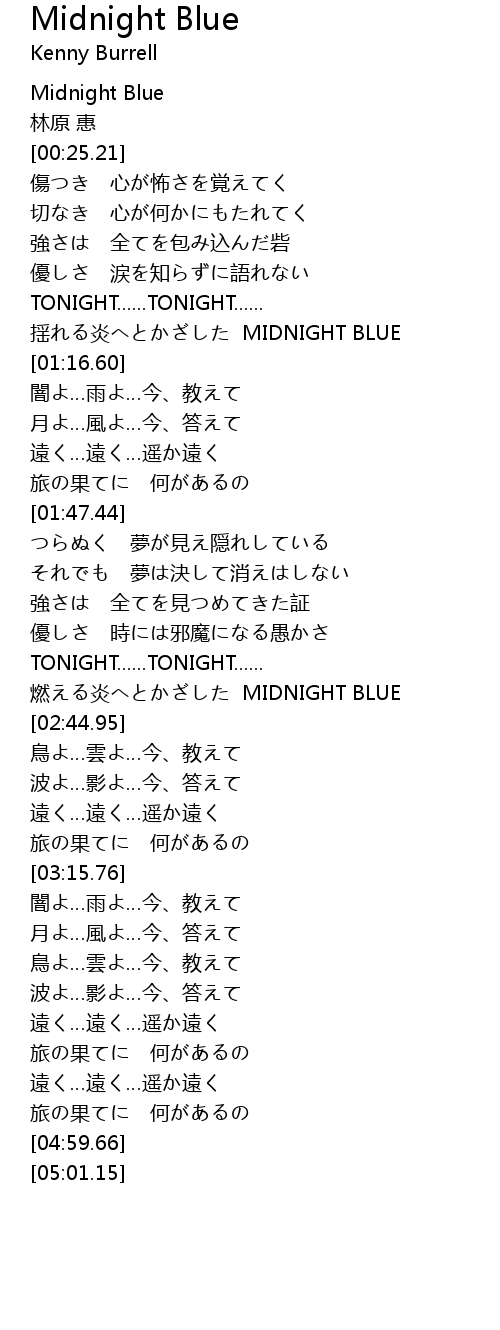 | [01:08.81] | 揺れる炎へとかざした MIDNIGHT BLUE |