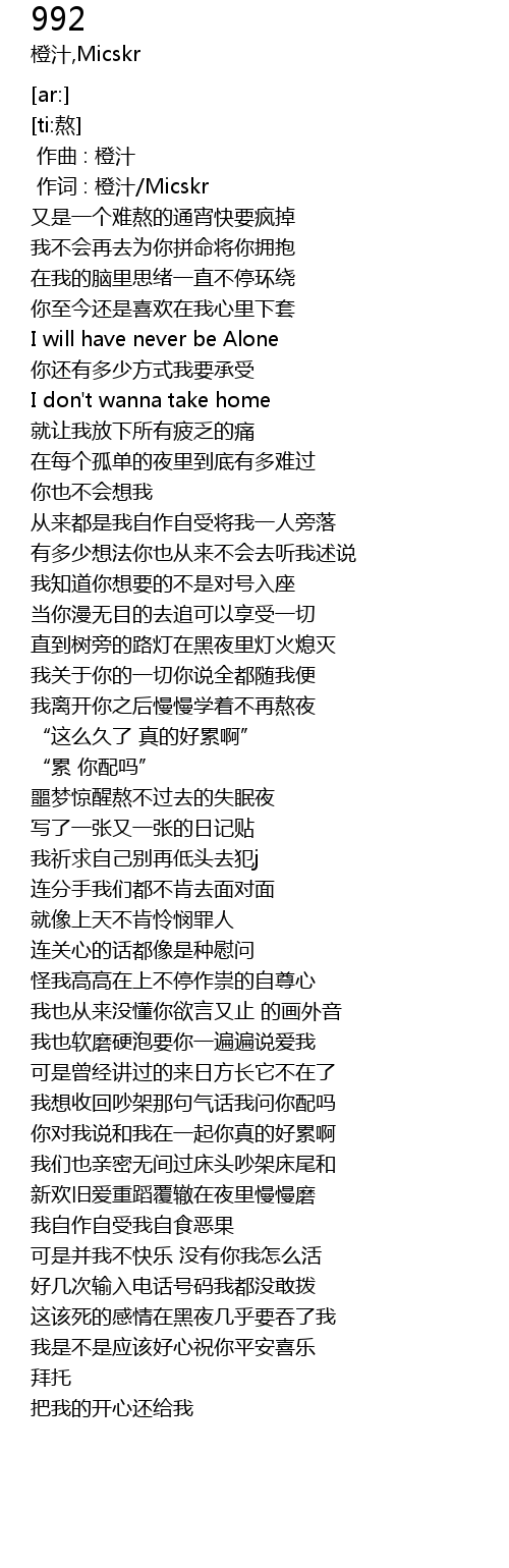 | [00:01.000] | 作词 : 橙汁/Micskr |