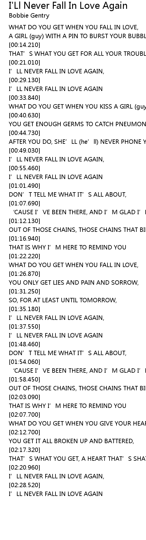 | [00:57.510] | I' LL NEVER FALL IN LOVE AGAIN |