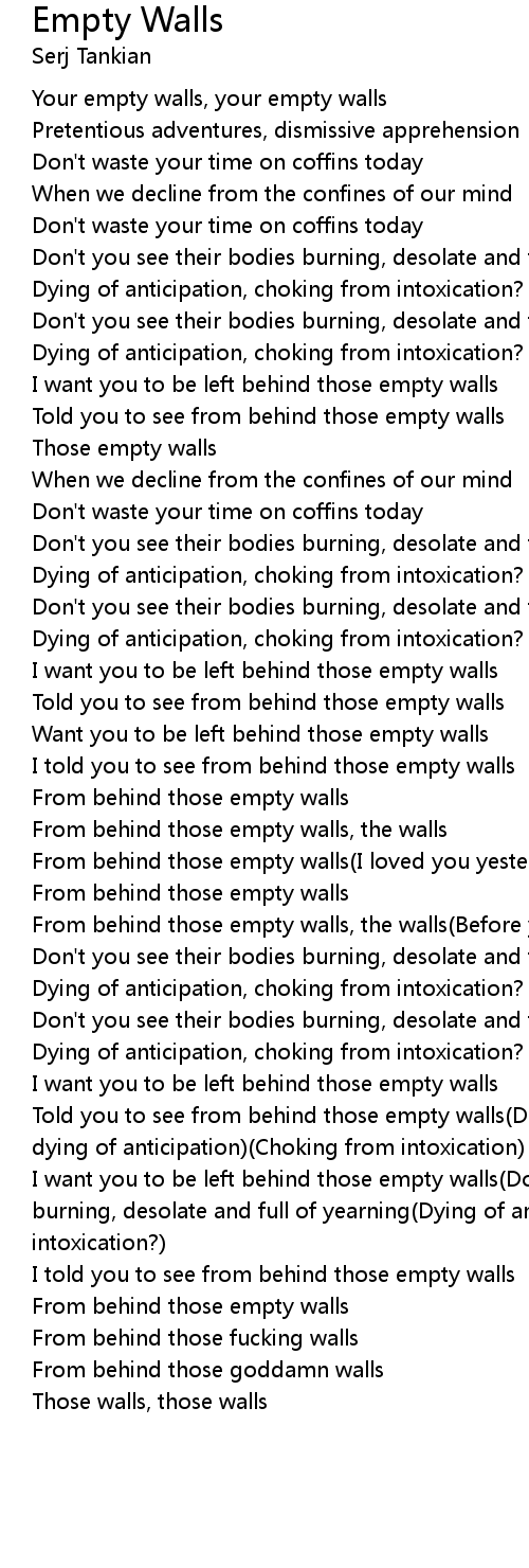 I want you to be left behind those empty walls(Don't you see their bodies burning, desolate and full of yearning(Dying of anticipation, choking from intoxication?) |