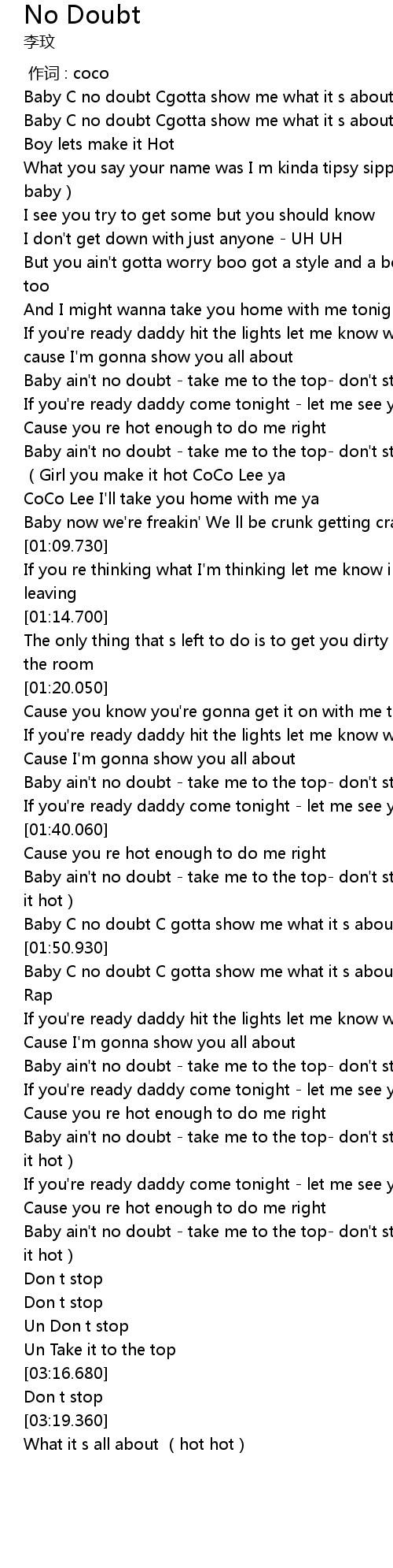 | [01:46.460] | Baby C no doubt C gotta show me what it s about (hot) |