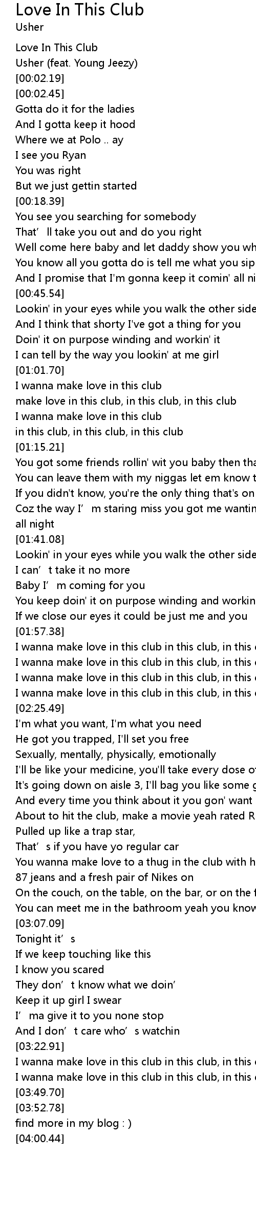 | [01:03.97] | make love in this club, in this club, in this club |