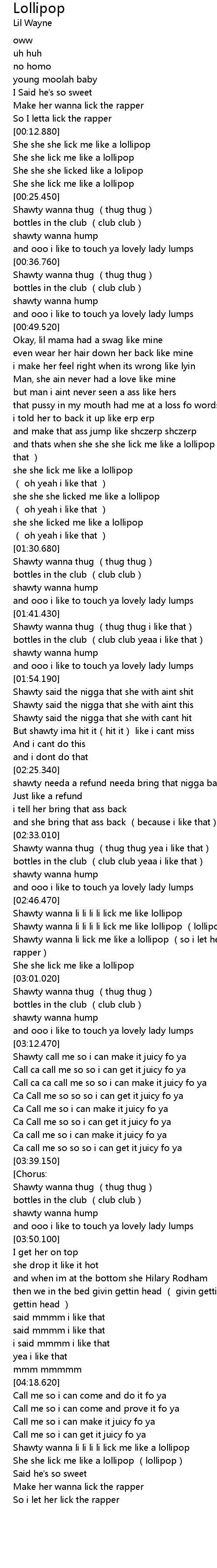 | [02:54.170] | Shawty wanna li lick me like a lollipop (so i let her lick the rapper) |
