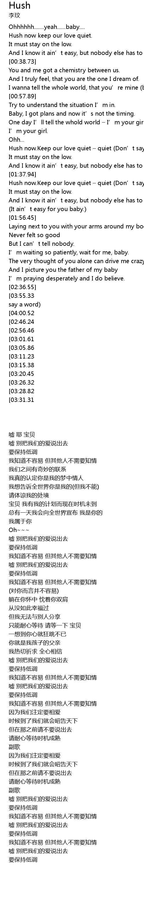 | [04:34.45][03:55.33][02:37.01] | Hush now. Keep our love quiet quiet Don' t say a word |