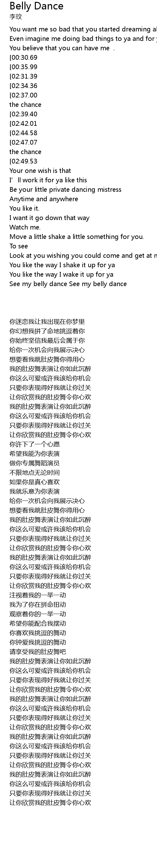 | [02:52.37][02:31.39][01:31.66][00:41.20] | You want to see my belly dance |
