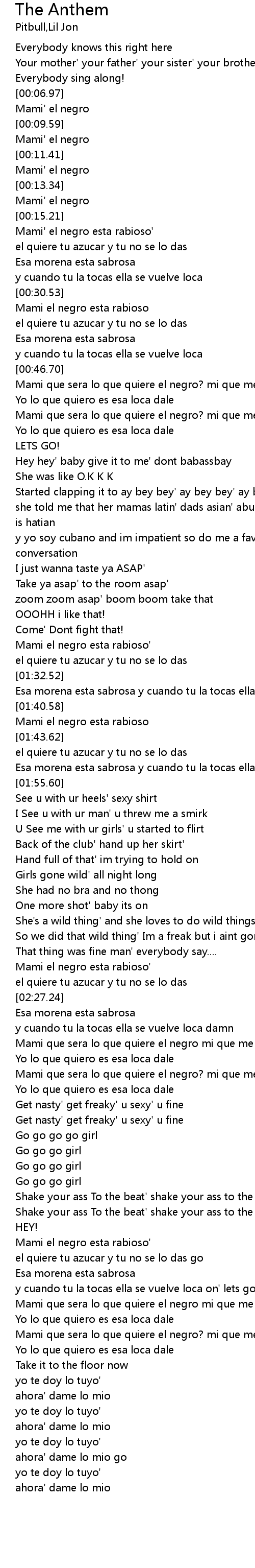 | [02:19.75] | Mami el negro esta rabioso' |