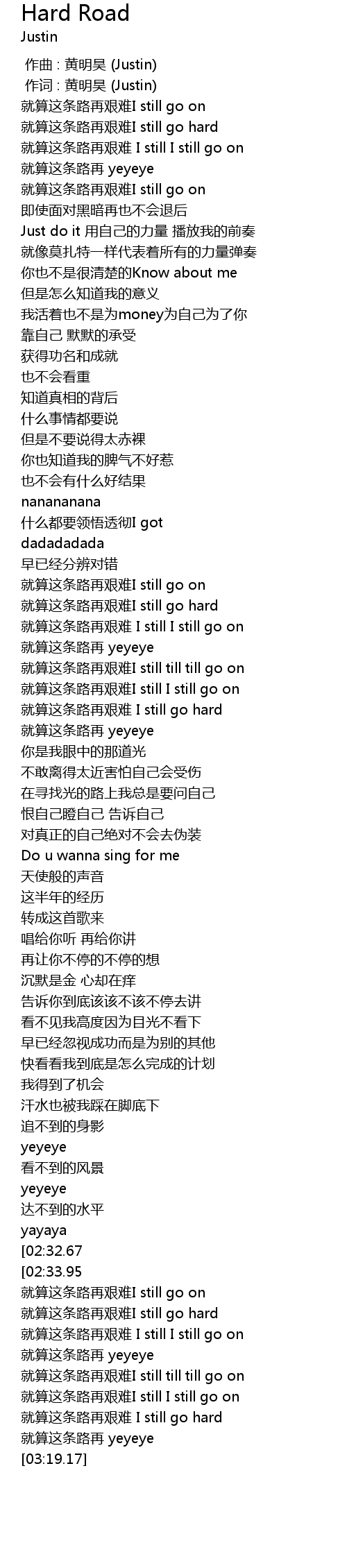 | [00:19.17] | 就算这条路再艰难I still go hard |