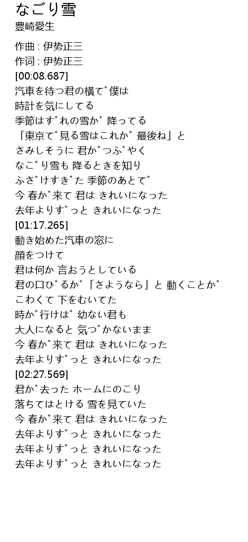| [00:40.364] | なごり雪も 降るときを知り |