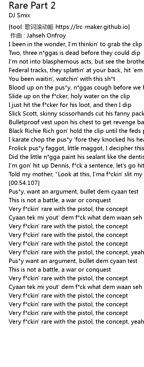 | [00:42.852] | Frolick pus y faggot, little maggot, I decipher this |