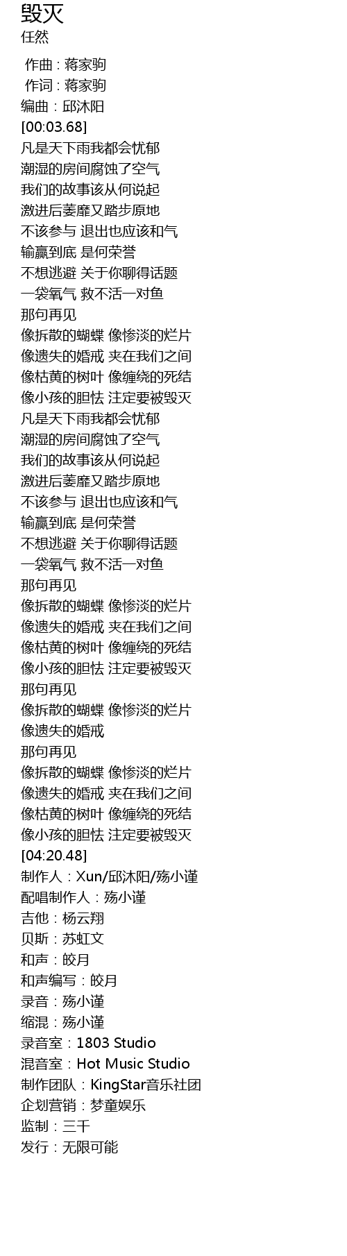 | [04:11.48] | 像小孩的胆怯 注定要被毁灭 |
