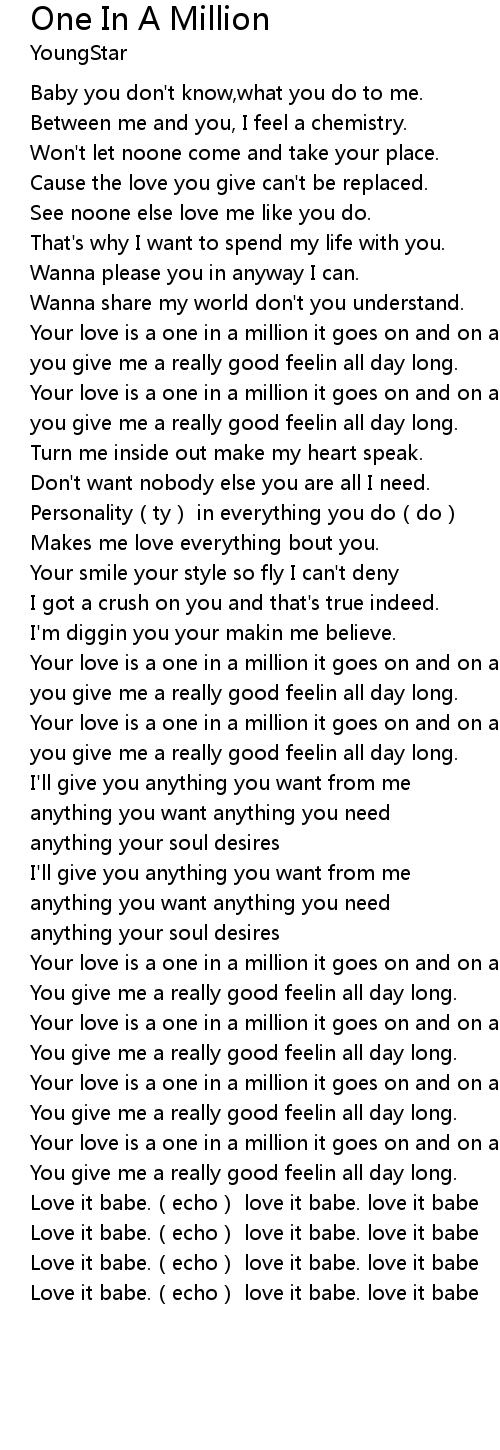 | [00:48.60] | Your love is a one in a million it goes on and on and on |