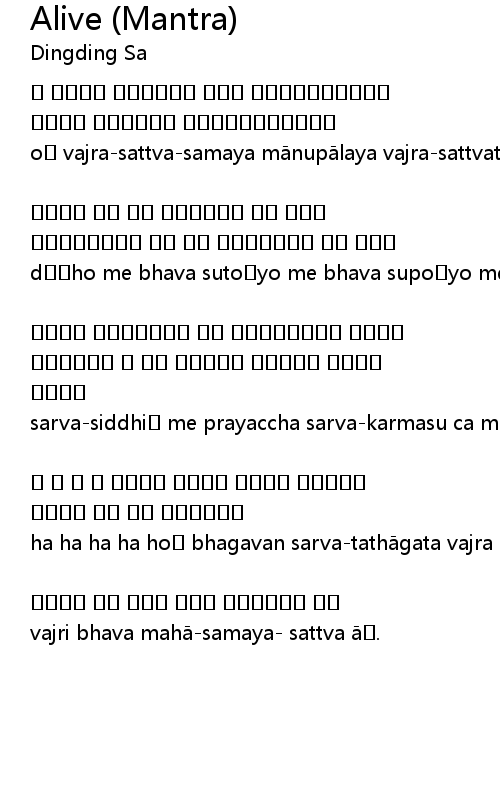 | ॐ वज्र सत्त्व समय मानुपालय। वज्र सत्त्व तवेनोपतिषथ। | |