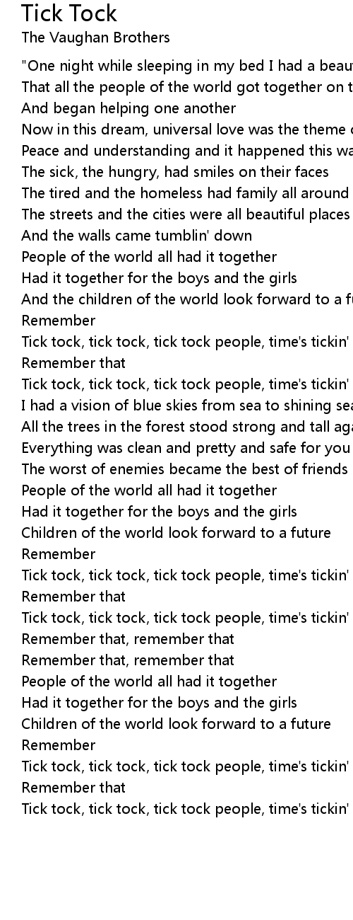 Tick tock, tick tock, tick tock people, time's tickin' away |