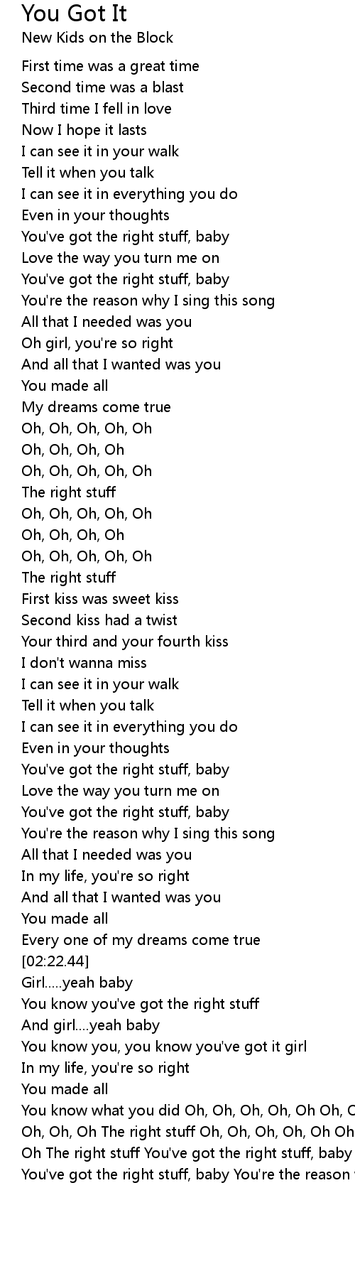 You know what you did Oh, Oh, Oh, Oh, Oh Oh, Oh, Oh, Oh, Oh Oh, Oh, Oh, Oh, Oh The right stuff Oh, Oh, Oh, Oh, Oh Oh, Oh, Oh, Oh, Oh Oh, Oh, Oh, Oh, Oh The right stuff You've got the right stuff, baby Love the way you turn me on You've got the right stuff, baby You're the reason why I sing this song |