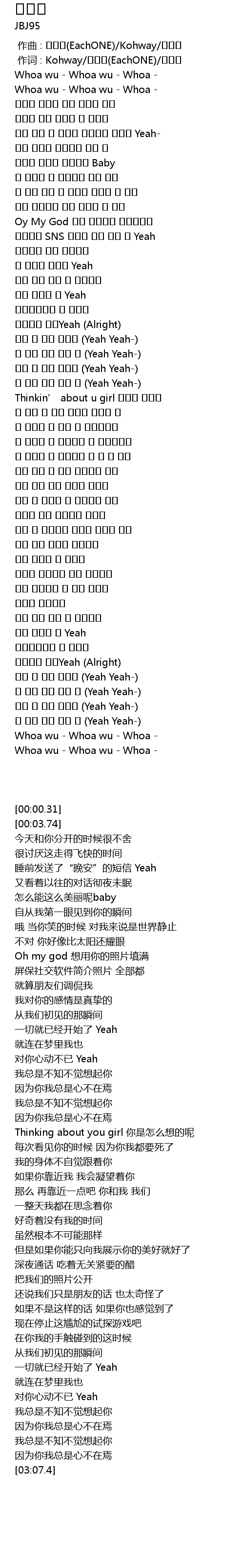 | [01:27.69] | Thinkin’ about u girl 어떻게 생각해 |
