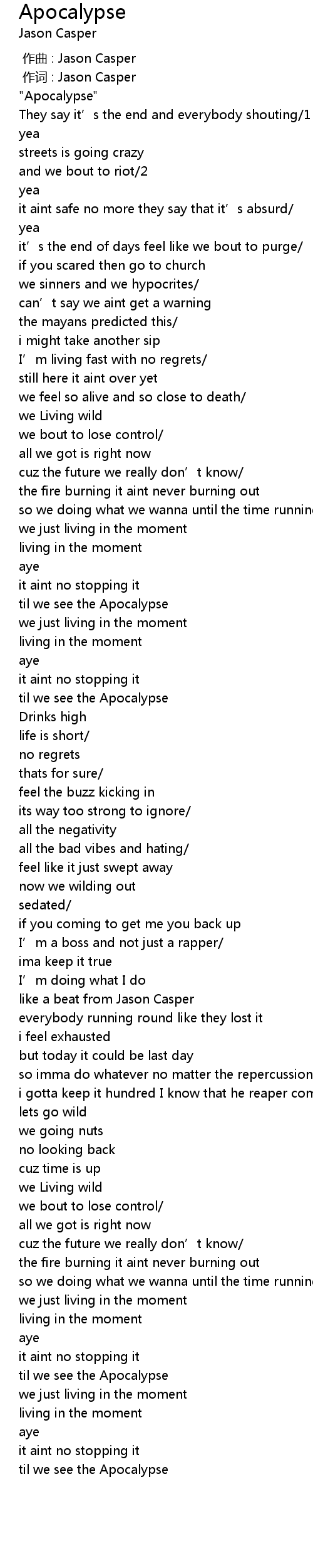 | [00:19.356] | it' s the end of days feel like we bout to purge |