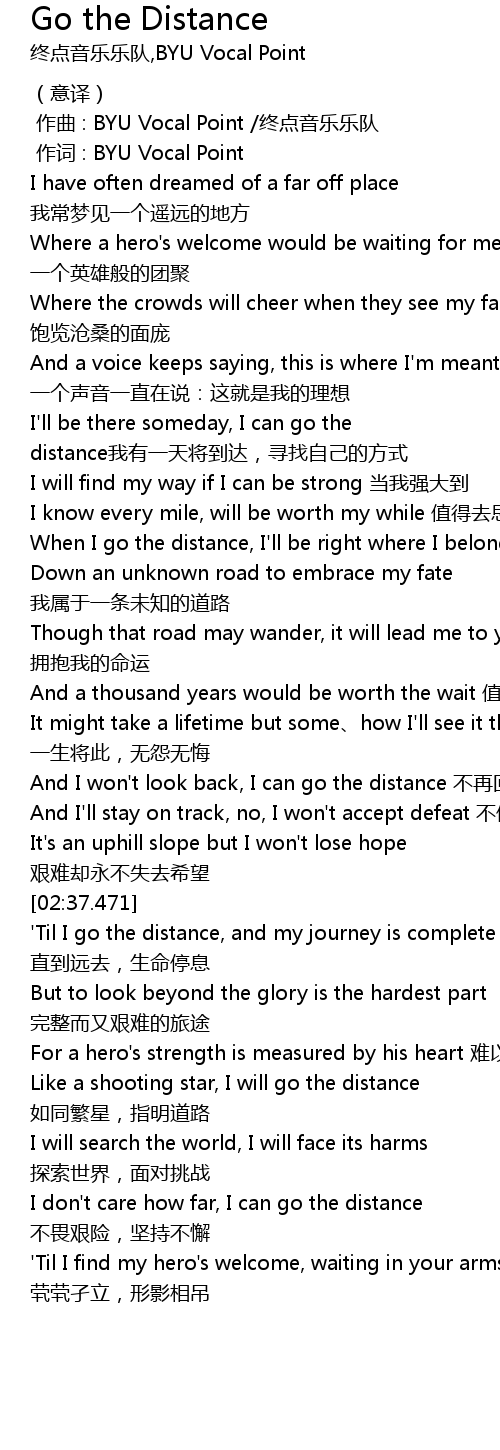 | [02:39.096] | ' Til I go the distance, and my journey is complete zhí dào yuǎn qù, shēng mìng tíng xī |