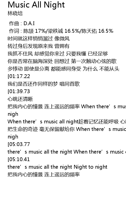 | [02:56.78][01:39.73] | When there' s music all night chèn zhe jì yì hái néng hū xī xīn tiào huán qīng xī |