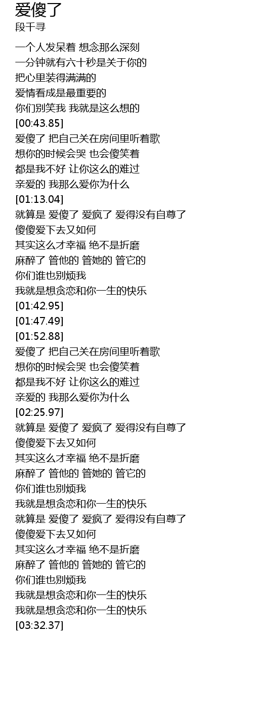 | [00:44.93] | 爱傻了 把自己关在房间里听着歌 |
