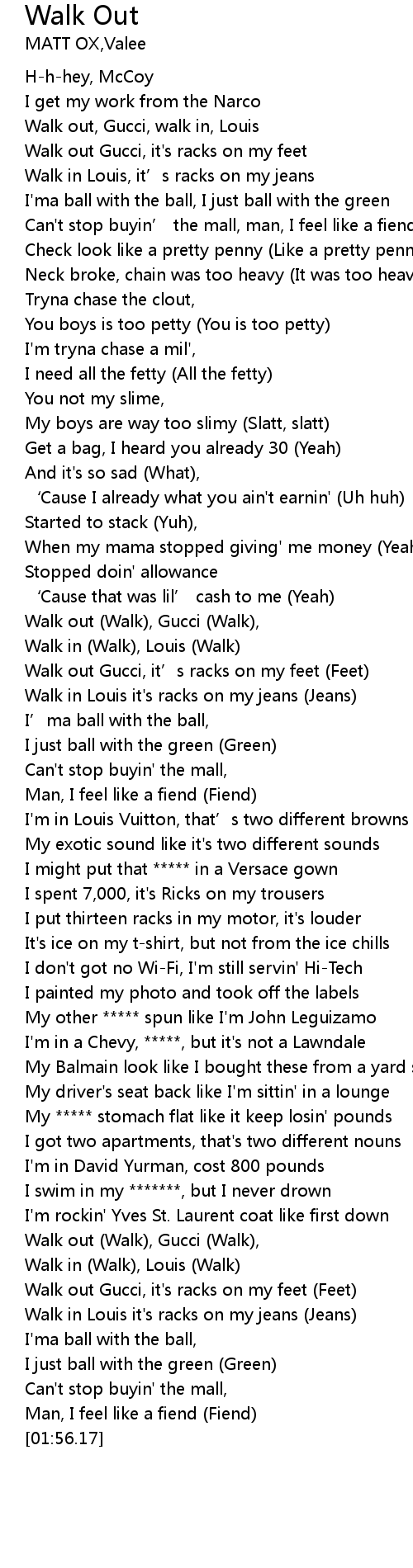 | [01:43.08] | Walk out (Walk), Gucci (Walk), |