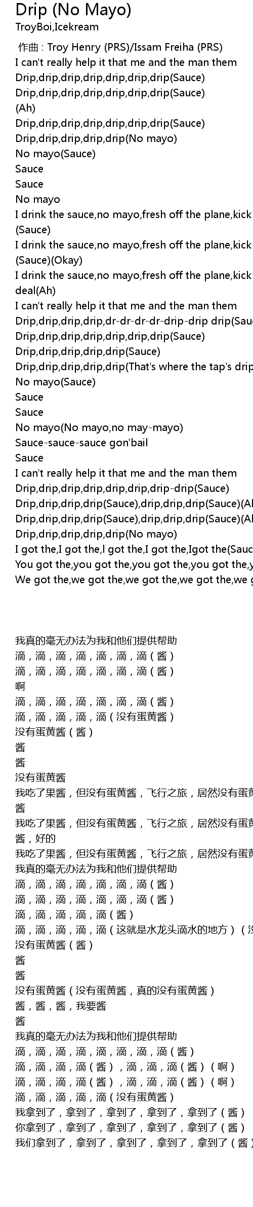 | [01:11.383] | Drip, drip, drip, drip, drip That' s where the tap' s drippin' No mayo |