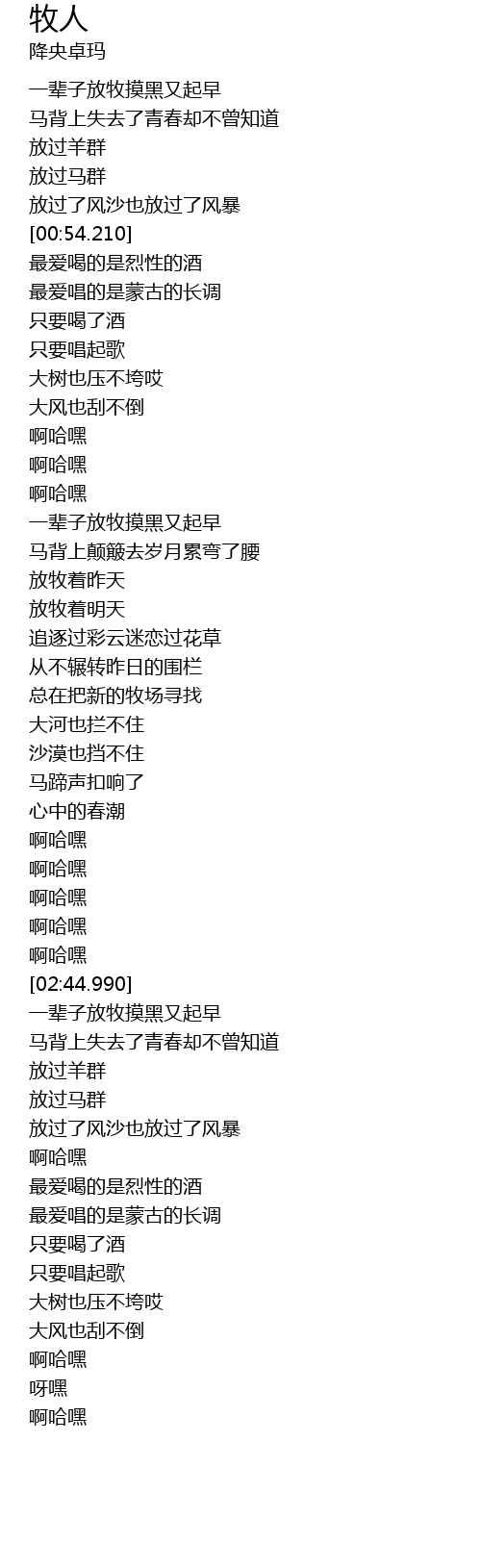 | [03:41.400] | 最爱唱的是蒙古的长调 |