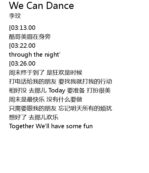 | [03:31.00][03:13.00][02:55.00][02:09.00][01:07.00][00:13.00] | wǒ men tiào wǔ dào tiān liàng kù gē měi méi zài shēn páng |