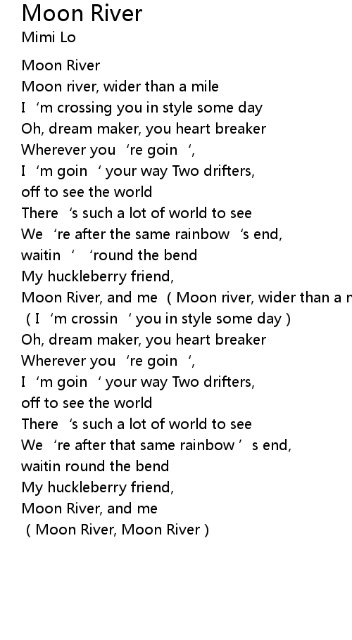 | [01:07.39] | Moon River, and me Moon river, wider than a mile |