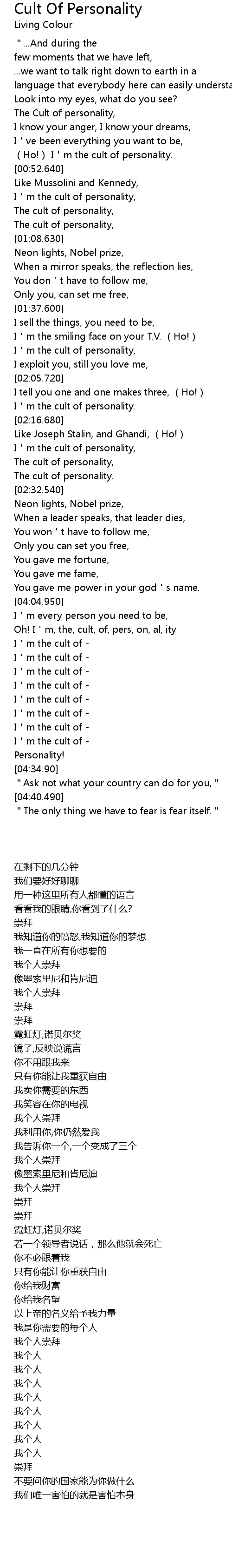 | [00:47.650] | (Ho!) I'm the cult of personality. |