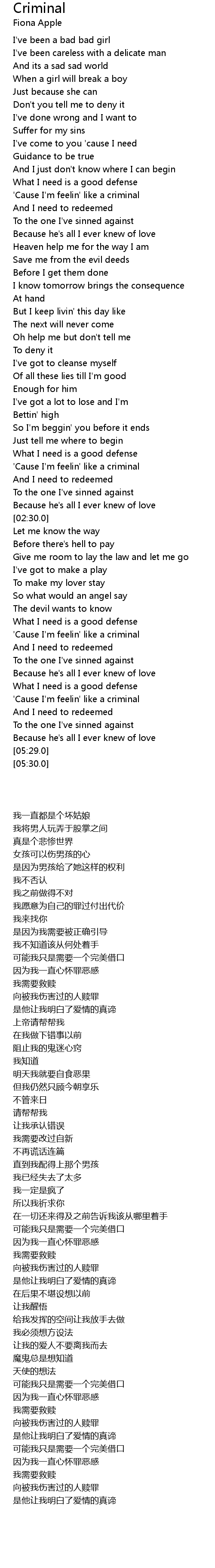 | [01:09.0] | ' Cause I' m feelin' like a criminal |