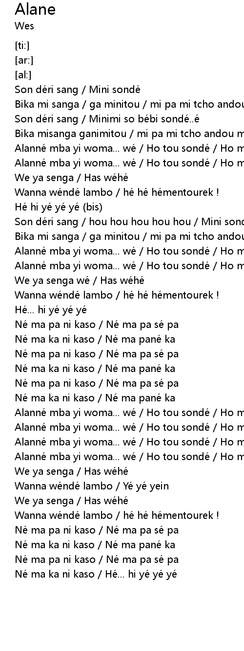 | [01:47.89] | Alanné mba yi woma... wé / Ho tou sondé / Ho ma... yé |