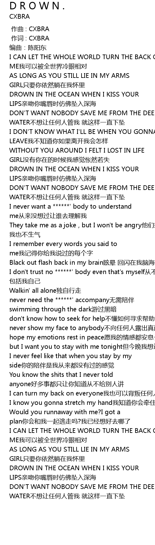 | [01:16.431] | DON'T WANT NOBODY SAVE ME FROM THE DEEP DEEP WATER不想让任何人管我 就这样一直下坠 |