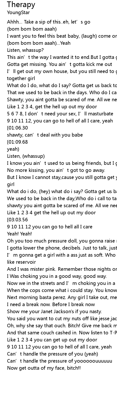 | [01:39.49] | shawty you aint gotta be scared of me. All we need is therapy |