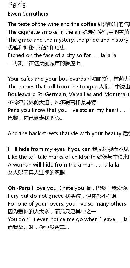 | Paris you know that you' ve stolen my heart la la la ba li, ni yi tou zou wo de xin | |