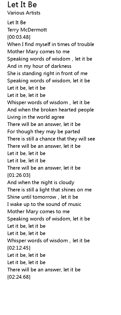 | [00:40.10] | Whisper words of wisdom, let it be |