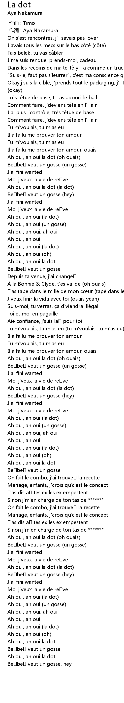 | [02:49.401] | Ah oui, ah oui la dot (la dot) |