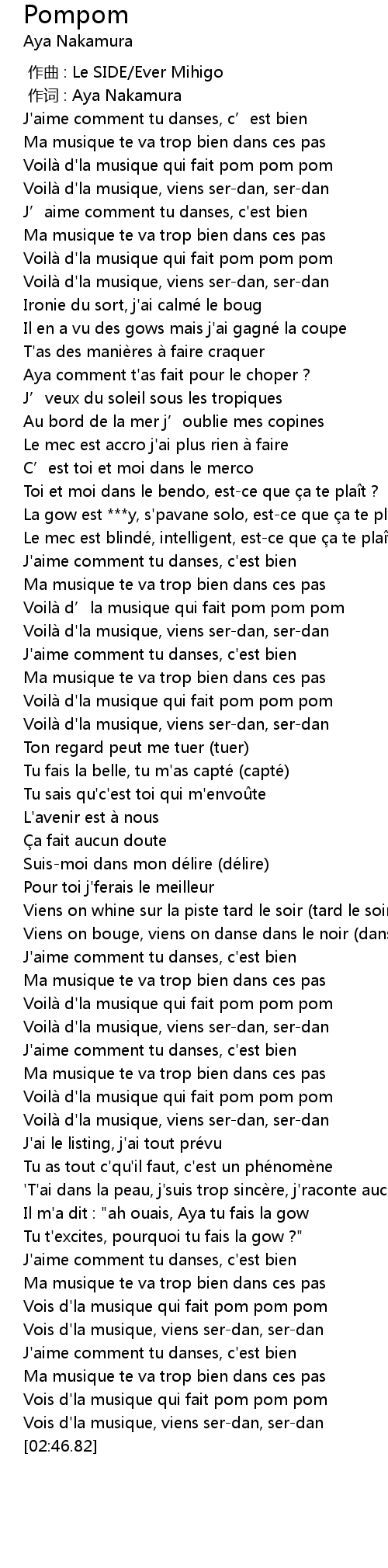 | [00:56.54] | La gow est ***y, s'pavane solo, est-ce que ça te plaît ? |