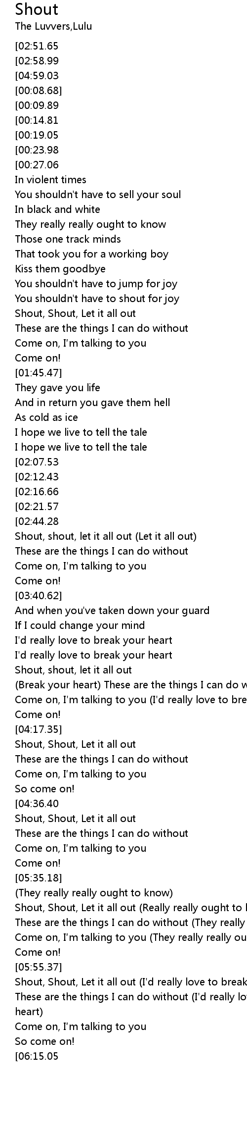 | [00:29.49][00:09.89] | Shout, Shout, Let it all out |