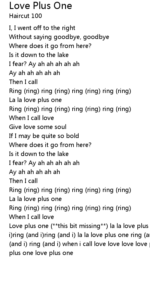 Love plus one (**this bit missing**) la la love plus one ring (and i)ring (and i)ring (and i)ring (and i) la la love plus one ring (and i) ring (and i) ring (and i) ring (and i) when i call love love love love plus one love plus one love plus one love plus one |