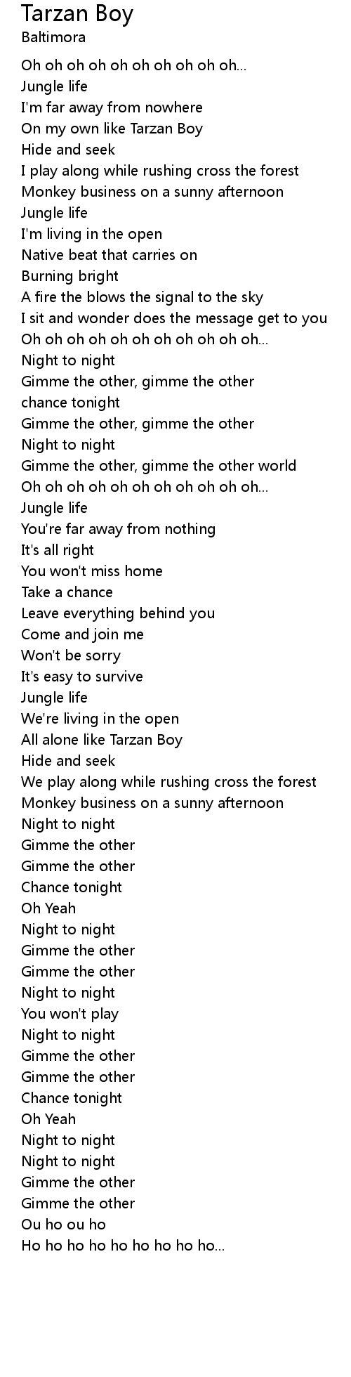 On my own like Tarzan Boy |