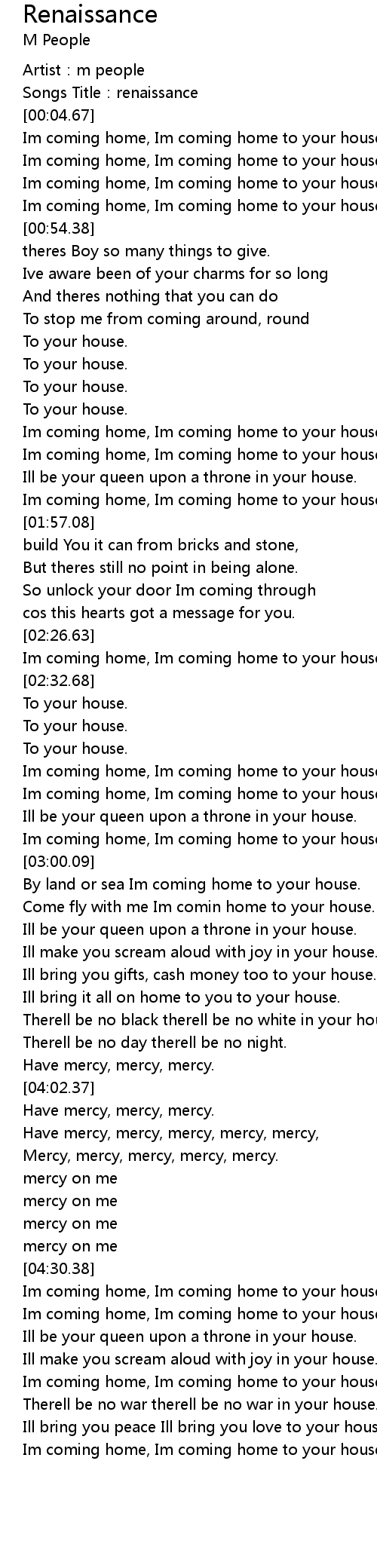 | [04:31.31] | Im coming home, Im coming home to your house. |