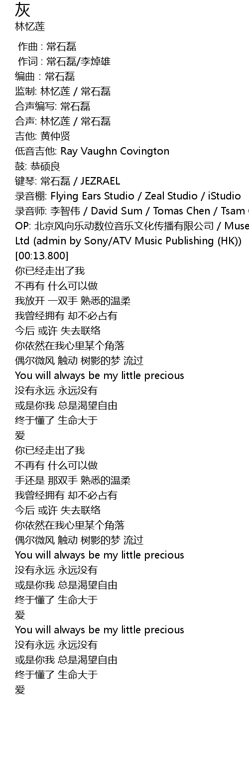 | [00:10.200] | lù yīn shī: lǐ zhì wěi David Sum Tomas Chen Tsam Chan chén zé zhōng |