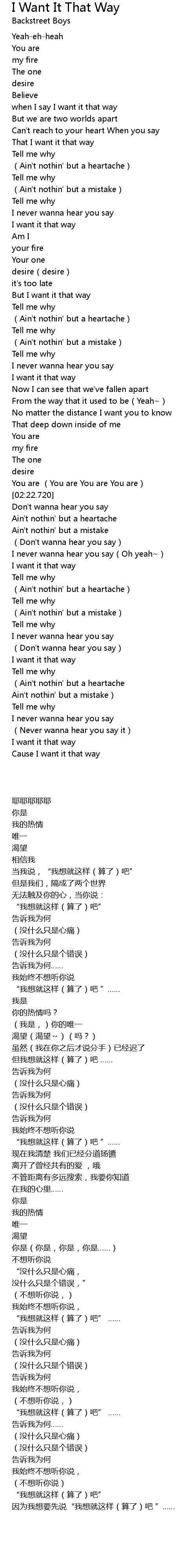 | [03:22.100] | Cause I want it that way |