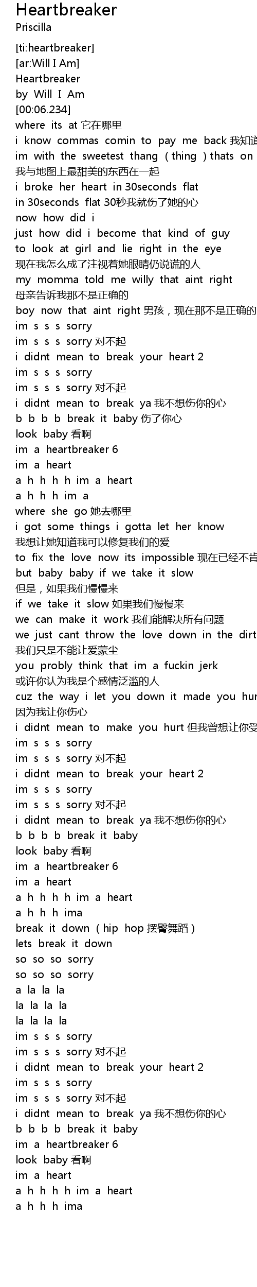 | [03:26.332]im a heartbreaker 6] | wǒ shì yí gè lìng rén shāng xīn de rén |