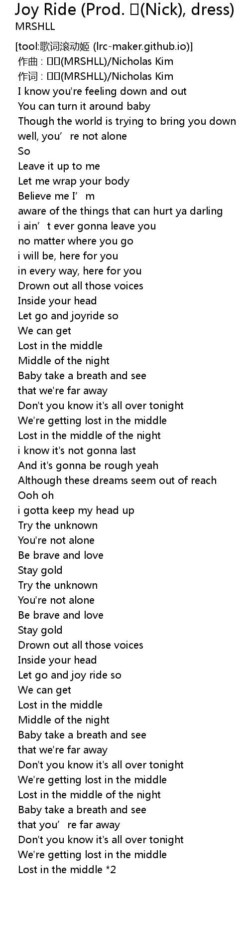 | [00:00.000] | zuo qu : MRSHLL Nicholas Kim |