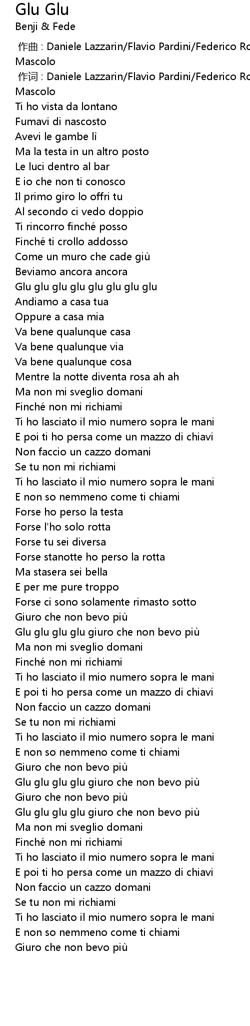 | [01:42.61] | Glu glu glu glu giuro che non bevo più |